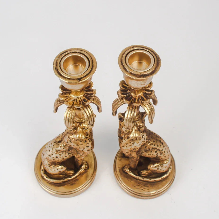 🐆 Luipaard Kandelaars (Set van 2) – Antiek Goudkleurige Statement Kandelaar - afmeting 10 x 10 x 28cm