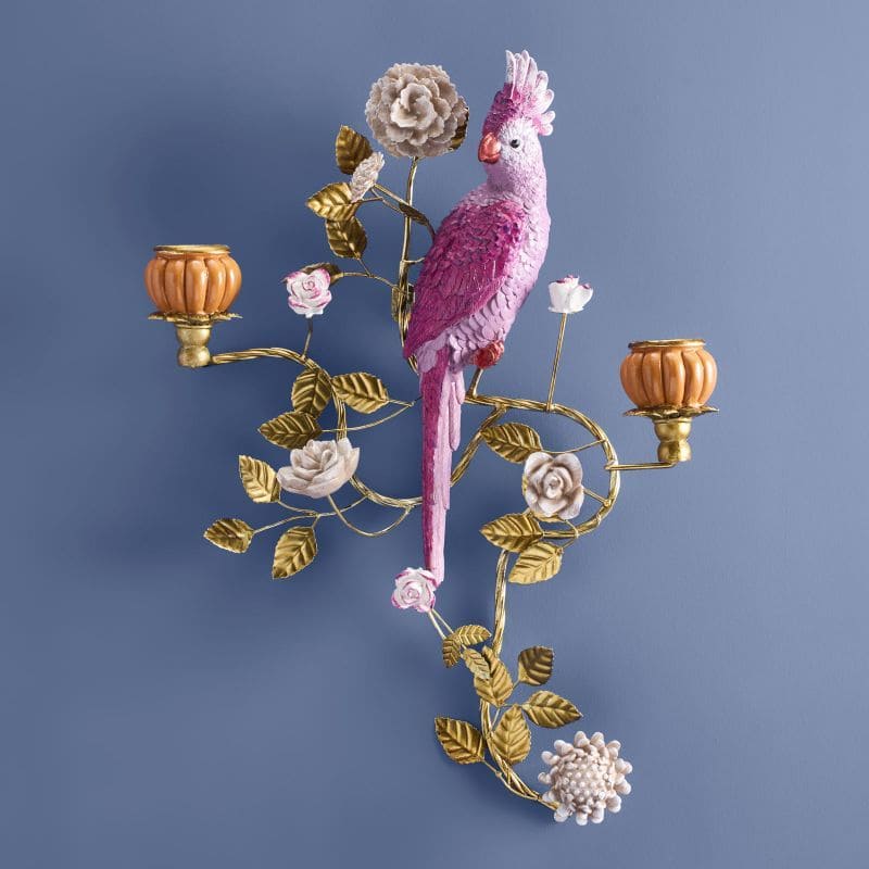 Deze stijlvolle wandkandelaar met papegaai is een echte eyecatcher voor aan de muur. Het verfijnde ontwerp met sierlijke takken, bladeren en bloemen geeft een speelse en luxe uitstraling.